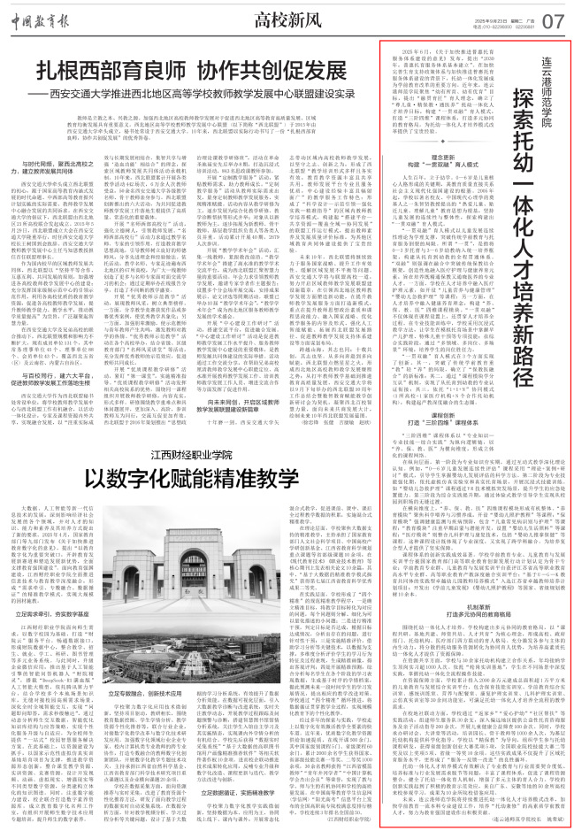 9月23日,《中国教育报》第07版刊发校长姚荣斌署名文章《探索托幼一体化人才培养新路径》。文章从构建“一贯双融”育人模式、打造“三阶四维”课程体系、打造多元协同的教育格局三个方面,深度阐述了学校托幼一体化人才培养模式改革的实践路径。