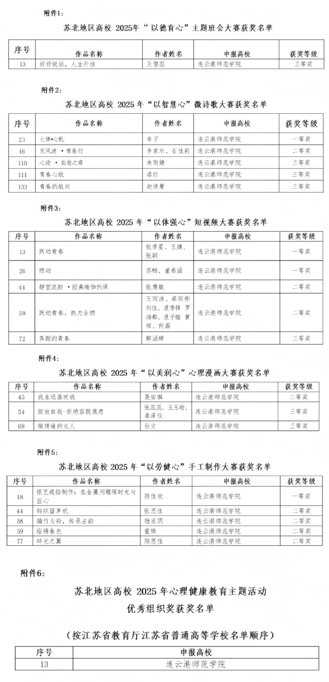 近日,在由江苏省苏北地区大学生心理健康教育研究中心主办的“五育润心 沐光同行”苏北地区高校2025年心理健康教育主题系列活动中,我校师生作品荣获一等奖4项、二等奖8项、三等奖7项,学校荣获“优秀组织奖”。