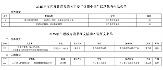 近日,省教育系统关工委公布了2025年“读懂中国”活动优秀作品名单和2025年主题教育读书征文活动入选征文名单,我校学生作品《穿过硝烟的星辰——一位退役大学生士兵眼中的信仰传承》《弘扬时代精神,建设教育强国》《吾辈正青春,同心护中华:一名新疆籍少数民族大学生党员的时代答卷》《永不熄灭的青春火炬——抗战精神的血脉传承》获奖。